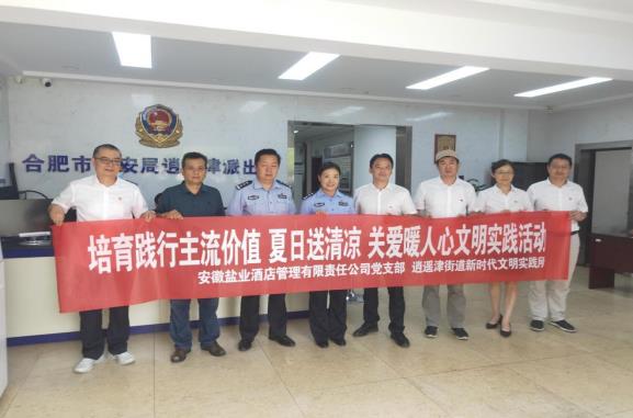 炎炎高溫送清涼,親切慰問(wèn)暖警心,一聲親切的問(wèn)候,一瓶清涼的礦泉水,表達(dá)著對(duì)一線勞動(dòng)者的敬意。8月10日下午,酒店管理公司黨支部的黨員志愿者們,在逍遙津街道文明辦鐘主任的陪同下,來(lái)到合肥市廬陽(yáng)區(qū)逍遙津派出所,看望慰問(wèn)辛勤堅(jiān)守在第一線的基層民警們,并為他們送去礦泉水、防暑降溫包等慰問(wèn)品,感謝他們?cè)诰S護(hù)轄區(qū)治安秩序和諧穩(wěn)定等方面做出的突出貢獻(xiàn)。