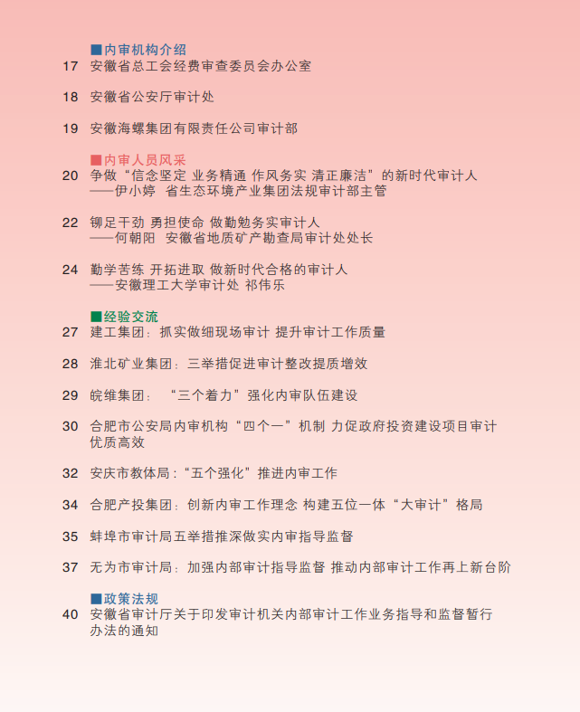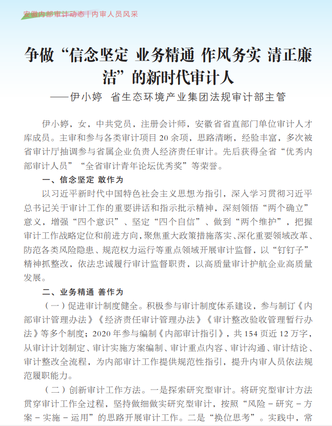 11月14日,集團公司法規(guī)審計部主管伊小婷同志被省審計廳編印的《安徽內部審計動態(tài)》第3期——“內審人員風采”欄目宣傳報道。
