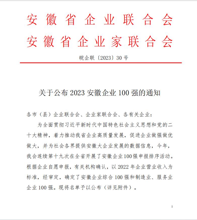 2023年11月22日,安徽省企業(yè)聯(lián)合會(huì)、安徽省企業(yè)家聯(lián)合會(huì)舉辦了2023安徽百?gòu)?qiáng)企業(yè)發(fā)布會(huì)暨企業(yè)家論壇,現(xiàn)場(chǎng)發(fā)布了“2023安徽省百?gòu)?qiáng)企業(yè)”榜單,及“2023安徽省制造業(yè)百?gòu)?qiáng)企業(yè) ”“2023安徽省服務(wù)業(yè)百?gòu)?qiáng)企業(yè)”榜單。該活動(dòng)迄今已經(jīng)連續(xù)開(kāi)展十九屆,基本囊括了安徽營(yíng)收規(guī)模排在前列的各類(lèi)企業(yè)。