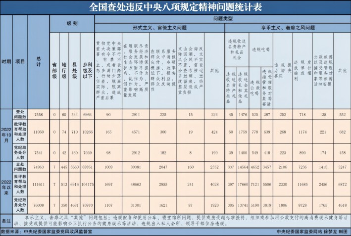 11月27日,中央紀(jì)委國家監(jiān)委公布了2022年10月全國查處違反中央八項規(guī)定精神問題匯總情況。今年10月,全國共查處違反中央八項規(guī)定精神問題7558起,批評教育幫助和處理11050人,其中,黨紀(jì)政務(wù)處分7541人,這是連續(xù)第110個月公布月報數(shù)據(jù)。
