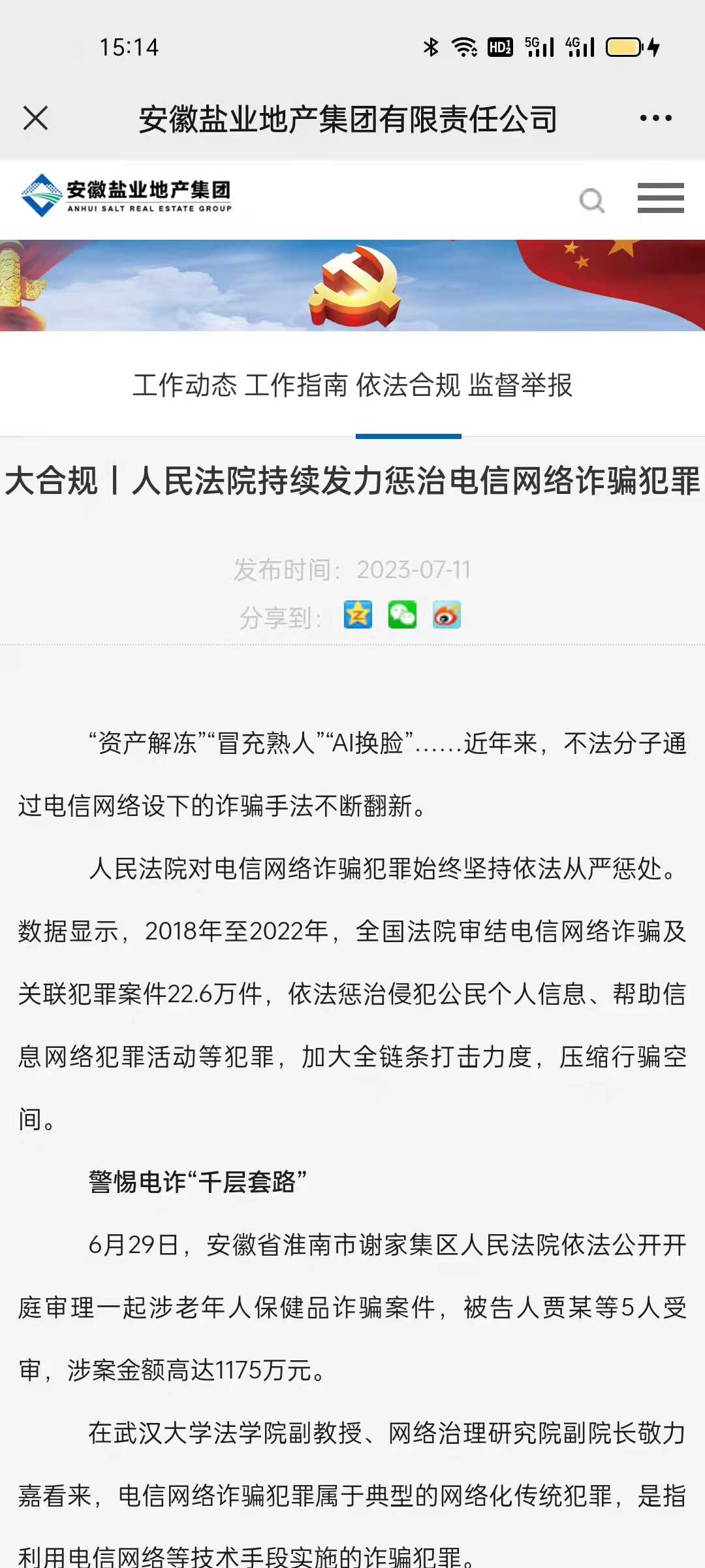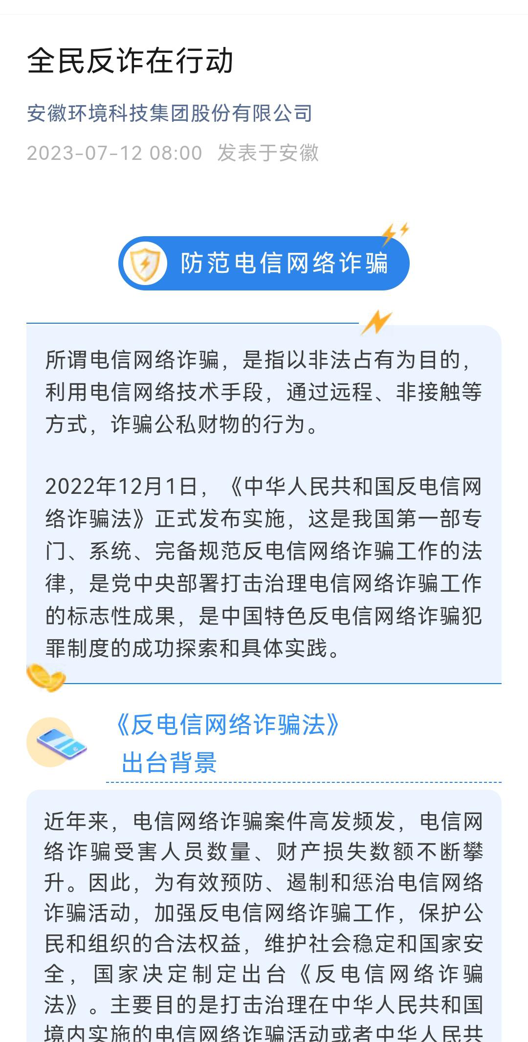 環(huán)境科技集團(tuán)、省健康養(yǎng)老、徽鹽金融等公司通過(guò)印制各類(lèi)反詐宣傳單、宣講防范電信詐騙安全知識(shí),在公眾號(hào)發(fā)表普法文章等形式,號(hào)召全體員工增強(qiáng)防范意識(shí)。