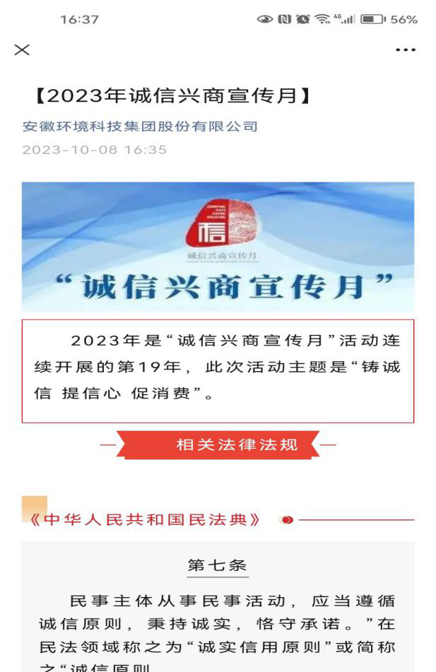 所屬環(huán)境集團、地產(chǎn)集團、酒店公司通過制作張貼誠信宣傳海報,在公眾號發(fā)表誠信主題文章等形式,號召公司全體職員牢固樹立誠信意識。