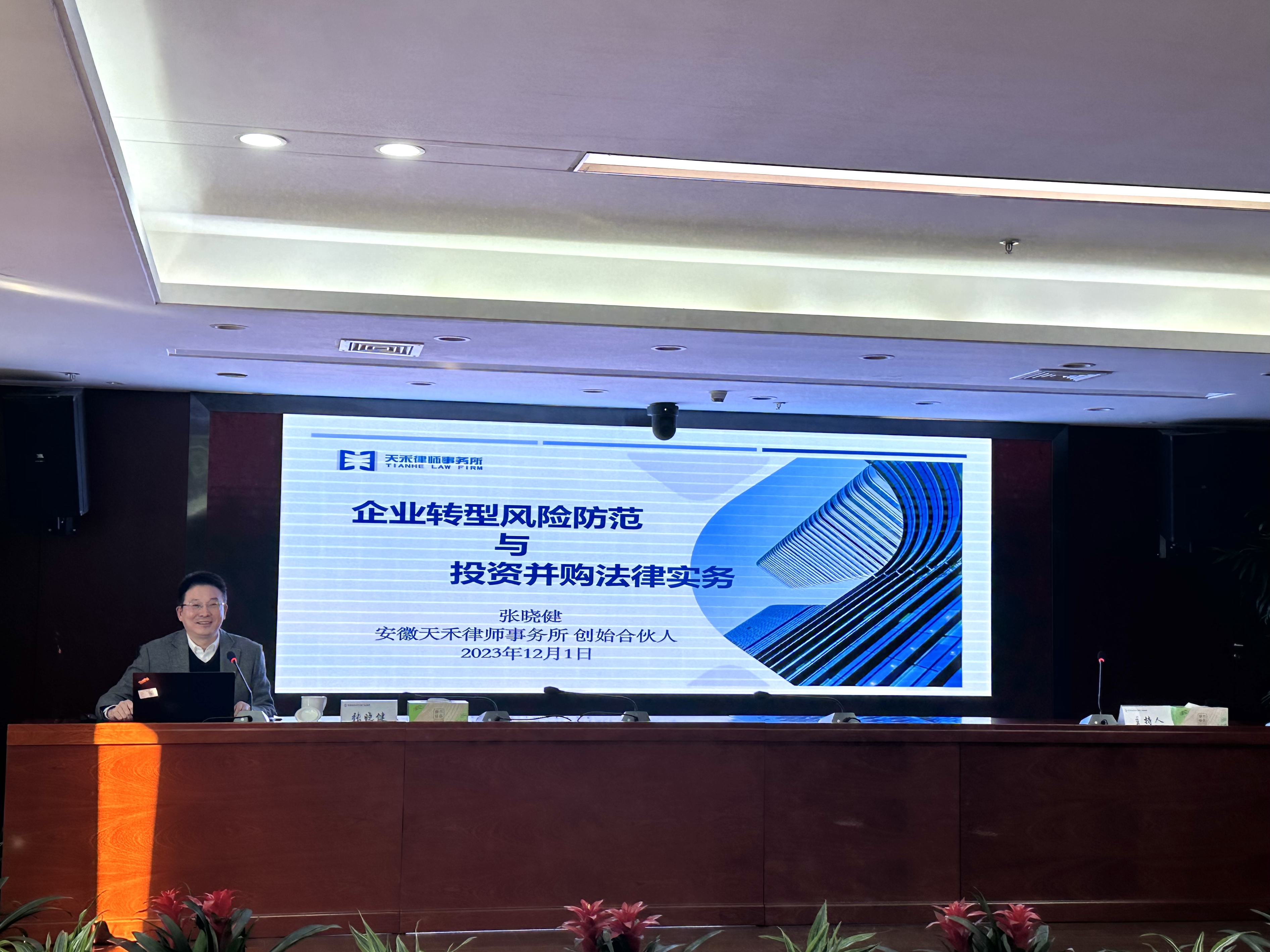培訓旨在弘揚憲法精神、培養(yǎng)員工合規(guī)管理意識、推動集團強化對投資并購問題集中領(lǐng)域的管控,防范和減少相關(guān)風險。安徽省人民政府法律顧問、安徽天禾律師事務(wù)所創(chuàng)始合伙人張曉健以“企業(yè)轉(zhuǎn)型風險防范與投資并購法律實務(wù)”為題展開專題講座。