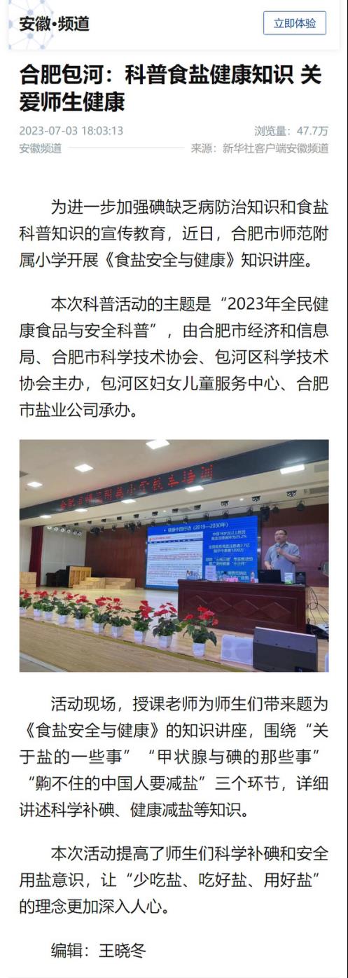 為切實(shí)做好黨的二十大精神宣傳貫徹工作,在習(xí)近平新時(shí)代中國(guó)特色社會(huì)主義思想指引下 ,進(jìn)一步樹牢以人民健康為中心的發(fā)展思想,合肥鹽業(yè)在合肥市師范附屬小學(xué)開展食鹽科普活動(dòng),為全校200余名師生普及科學(xué)補(bǔ)碘、健康減鹽知識(shí),關(guān)愛師生健康,推廣中鹽低鈉鹽,助力健康中國(guó)建設(shè),食鹽健康科普活動(dòng)得到新華社客戶端安徽頻道關(guān)注報(bào)道,截至發(fā)稿日總瀏覽量達(dá)47.7萬次。