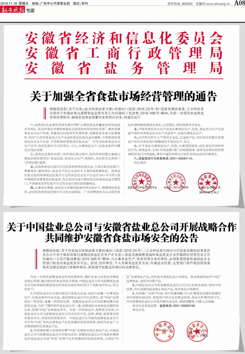 2、完善食鹽專業(yè)化監(jiān)管體制。保持現(xiàn)有專業(yè)化食鹽監(jiān)管體制不變,由鹽業(yè)主管機(jī)構(gòu)依法負(fù)責(zé)食鹽管理與監(jiān)督。各級(jí)鹽業(yè)主管機(jī)構(gòu)與公安、司法、衛(wèi)生計(jì)生、工商、質(zhì)檢、食品藥品監(jiān)管等部門各司其職、密切協(xié)作,依法加強(qiáng)食鹽安全監(jiān)管。
