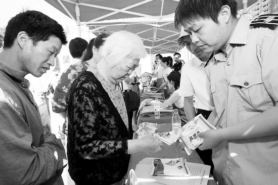 鹽政執(zhí)法人員向消費者講解怎樣辨別真假食用碘鹽。5月15日是我國第18個“防治碘缺乏病日”,省有關(guān)部門在合肥舉行了宣傳活動。(記者許昊攝)
