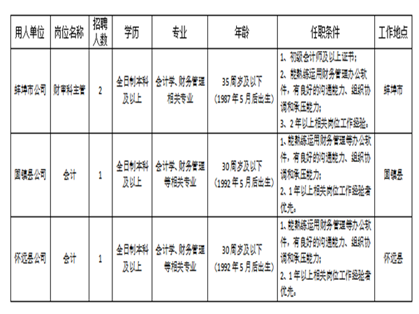 2、縣公司會(huì)計(jì):男女不限,全日制本科及以上學(xué)歷,年齡30周歲及以下,會(huì)計(jì)學(xué)、財(cái)務(wù)管理等相關(guān)專(zhuān)業(yè);1年以上相關(guān)崗位工作經(jīng)驗(yàn)者優(yōu)先。