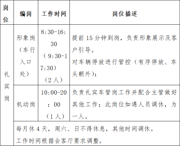 (3)客服崗:選派的客服人員必須經(jīng)過專業(yè)技能培訓(xùn),身體健康,品行良好,無違法違紀(jì)犯罪前科,具有初中以上文化程度,年齡在21至45周歲、身高1.65米以上。對現(xiàn)場的客戶接待服務(wù)工作有一定的意識。
