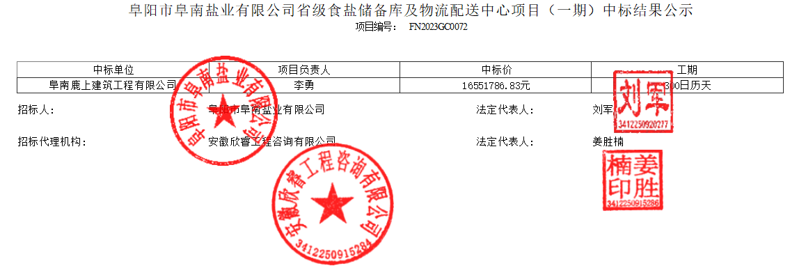 阜陽市阜南鹽業(yè)有限公司省級(jí)食鹽儲(chǔ)備庫及物流配送中心項(xiàng)目(一期)中標(biāo)結(jié)果公示