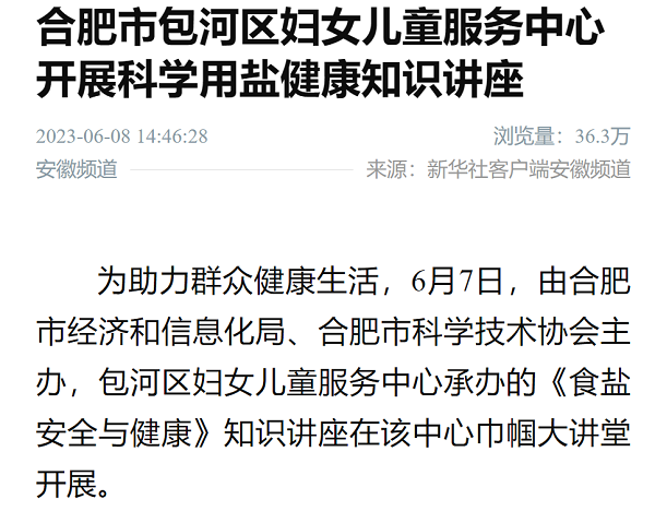 6月8日,新華社客戶端安徽頻道發(fā)表題為《合肥市包河區(qū)婦女兒童服務(wù)中心開展科學(xué)用鹽健康知識(shí)講座》的文章,截至發(fā)稿日瀏覽量達(dá)40.7萬人次。