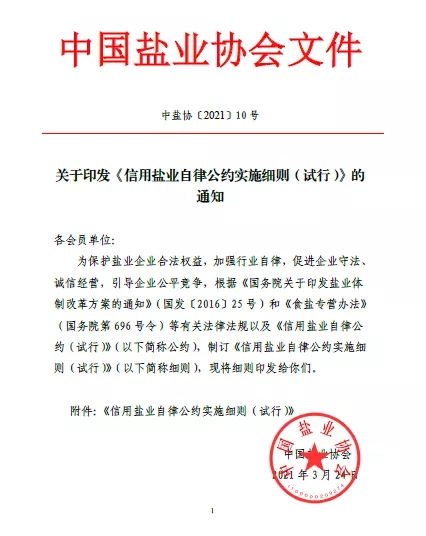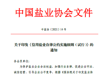 此次中國鹽業(yè)協(xié)會發(fā)布的《<信用鹽業(yè)自律公約>實(shí)施細(xì)則(試行)》,可以說是對2017年《信用鹽業(yè)自律公約(試行)》的有益補(bǔ)充。