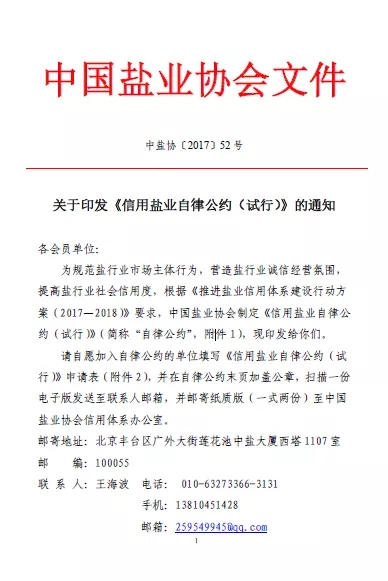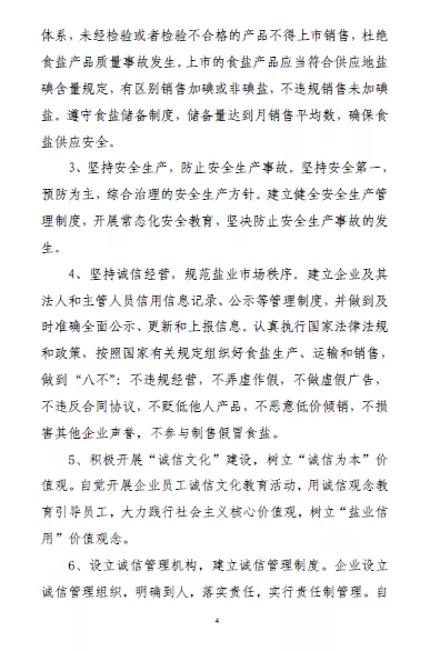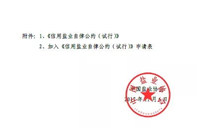 2017年11月6日,為規(guī)范鹽行業(yè)市場主體行為,營造鹽行業(yè)誠信經(jīng)營氛圍,提高鹽行業(yè)社會信用度,中國鹽業(yè)協(xié)會制定《信用鹽業(yè)自律公約(試行)》。該《自律公約》從守法合規(guī)、確保食鹽質(zhì)量與安全、防止安全生產(chǎn)事故、堅持誠信經(jīng)營、開展誠信文化建設(shè)、設(shè)立誠信管理機(jī)構(gòu)等6方面進(jìn)行行業(yè)自律。各食鹽定點(diǎn)批發(fā)企業(yè)、食鹽定點(diǎn)生產(chǎn)企業(yè)和中國鹽業(yè)協(xié)會會員單位可自愿加入信用鹽業(yè)自律公約。