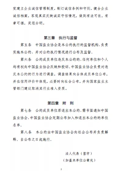 對違反公約第四條 1 款的(守法合規(guī)),依法處理,依規(guī)執(zhí)行,對不履行鹽行業(yè)自律義務(wù),有損行業(yè)和他人利益的行為,視情節(jié)輕重采取通報、降低信用等級直至取消會員資格。