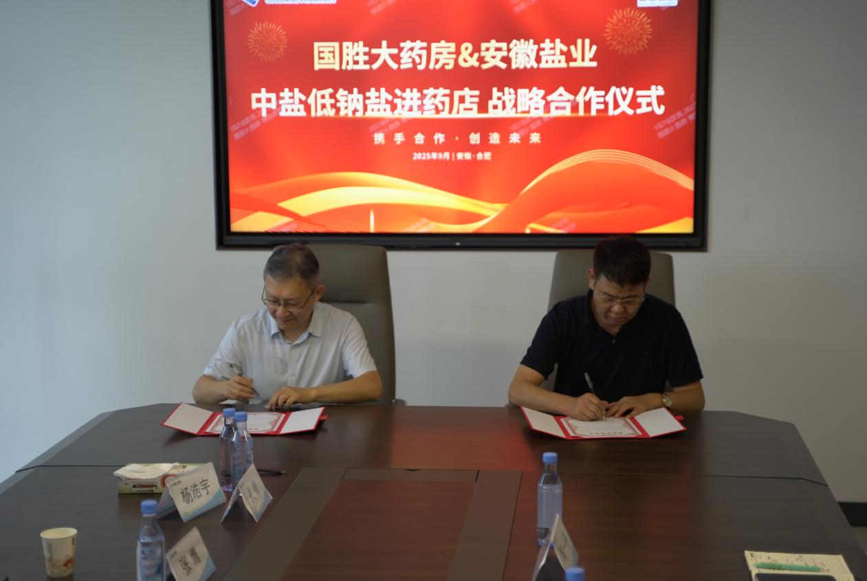 儀式現(xiàn)場(chǎng),雙方圍繞“高鹽飲食危害防控”與“低鈉鹽全民推廣路徑”展開(kāi)深入研討,達(dá)成了“政策同向、使命同頻”的戰(zhàn)略共識(shí),共同致力于將健康干預(yù)覆蓋至家庭單元。隨后,安徽省鹽業(yè)集團(tuán)與國(guó)勝大藥房簽署了戰(zhàn)略合作協(xié)議,安徽省鹽業(yè)集團(tuán)與中鹽東興公司共同向國(guó)勝大藥房授予“中鹽低鈉鹽指定銷(xiāo)售門(mén)店”牌匾,宣告低鈉鹽的健康推廣與銷(xiāo)售在醫(yī)藥渠道正式啟動(dòng)。